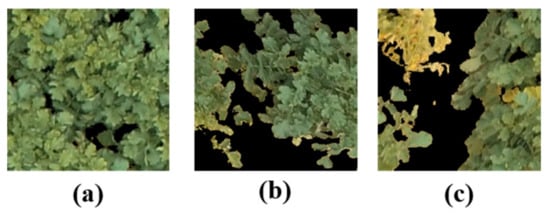 The altitude of 3 m was chosen for experiments on the RGB dataset because each region in the radish field (radish, soil, and mulching film) is clear and separated. Moreover, the wilt regions are detected easily at the altitude of 3 m compared to other altitudes (7 m, 15 m). We then randomly picked 50 RGB images to validate and construct a new RGB dataset manually. It contained 600 region of interest (ROI) for radishes, 580 ROIs for soil, and 520 ROI for plastic mulch, as shown in Figure 3. The proposed deep learning model was trained on the RGB-ROI dataset to classify three ROI on a radish field.