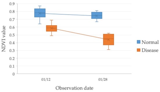 The NIR dataset contained two radish fields; one field was healthy radish field, whereas the other field was reported by the farmers to show early symptoms of Fusarium wilt disease. We randomly picked ten radishes from the field without wilt disease and ten radishes from the infected field. Next, the drone was used to captured one image for each spot at two different times (12 January 2018 and 28 January 2018) to check the NDVI indicator when the disease became more serious. Therefore, the NDVI value was calculated for a total of 20 images collected from each observation date. Figure 13 shows the NDVI values of the ten radish samples taken from the field without wilt disease, and ten radish samples were taken from the radish field infected with wilt disease on the 12 and the 28 of January 2018. On 12 January 2018, the highest NDVI values were recorded for samples on the field without wilt disease. In contrast, lower NDVI values occurred for samples on the field infected by Fusarium wilt disease. NDVI values acquired 16 days later for the field infected with wilt disease showed even lower NDVI values because the disease had slowly spread out and deteriorated the vascular elements in the petioles, resulting in the stunted plant.