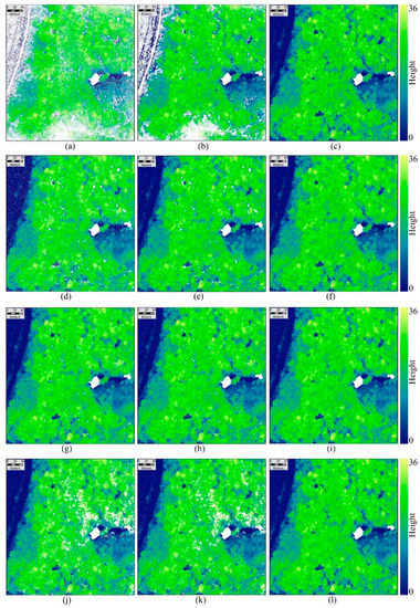 Original canopy height models (CHMs) and interpolated CHMs by the constrained neighbor (CN) and ordinary neighbor (ON) algorithms from the LiDAR and photogrammetry data sets with a spatial resolution of 0.1 m (no data areas are white): (a) original CHM of L-D55; (b) CHM of L-D55 interpolated by the CN algorithm; (c) CHM of L-D55 interpolated by the ON algorithm; (d) original CHM of P1-D300; (e) CHM of P1-D300 interpolated by the CN algorithm; (f) CHM of P1-D300 interpolated by the ON algorithm; (g) original CHM of P3-D150; (h) CHM of P3-D150 interpolated by the CN algorithm; (i) CHM of P3-D150 interpolated by the ON algorithm; (j) original CHM of P1-D80; (k) CHM of P1-D80 interpolated by the CN algorithm; and (l) CHM of P1-D80 interpolated by the ON algorithm. The color describes the lowest to highest height from blue to green. The CHMs of P2-D150 and P4-D150 are similar to that of P3-D150 at the same flying height of 150 m and thus are not shown here.