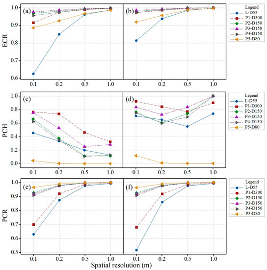 The ECRs, PCHs and PCRs of P-CHMs are shown in Figure 4. All the ECRs of the original P-CHMs were greater than those of the L-CHM at spatial resolutions less than 1.0 m, which indicated that the photogrammetry data sets had fewer holes than the LiDAR data set. The ECRs of the original and interpolated P-CHMs also increased as the spatial resolution decreased.