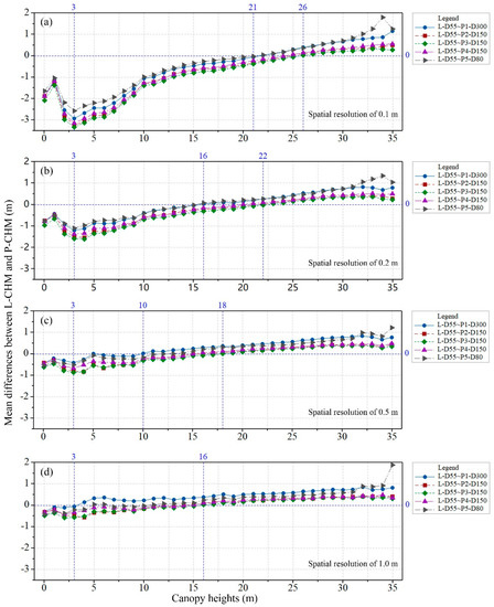 The stratified mean differences between the original L-CHM and P-CHMs within the 1.0 m bin of the canopy heights were calculated to analyze the spatial variations among canopy heights (Figure 5). Three mark heights of mean differences were observed along the canopy heights, including the minimum mark height, negative mark height and positive mark height. The minimum mark height of the mean difference between CHMs at a spatial resolution of 0.1 m was the 3.0 m bin of the canopy height corresponding to a minimum mean difference of 3.3 m. All the mean differences between CHMs with a spatial resolution of 0.1 m were negative when the canopy height was less than the 21.0 m bin and were positive when the canopy height was greater than the 26.0 m bin, which were referred to as negative and positive mark heights, respectively. The mean differences increased from negative to positive as the canopy height increased above the 3.0 m bin. This result indicated that photogrammetry tends to overestimate the low canopy heights and underestimate the high canopy heights compared to those obtained from LiDAR data.