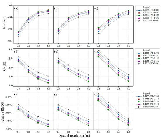 The L-CHMs and P-CHMs interpolated by the CN algorithm had slight effects on the and root mean square errors (RMSEs) compared with those between the original L-CHM and P-CHMs. The RMSEs between the interpolated L-CHM and P-CHMs by the ON algorithm were higher than those between the interpolated CHMs by the CN algorithm, which was expected. The relative RMSEs between the interpolated L-CHM and P-CHMs by the ON algorithm increased by approximately 3.1% compared with those between the original L-CHM and P-CHMs with a spatial resolution of 0.1 m. This result indicated that the ON interpolation algorithm would introduce obvious spatial variation into the CHM at fine spatial resolution. The relative RMSE decreased as the spatial resolution became coarser.