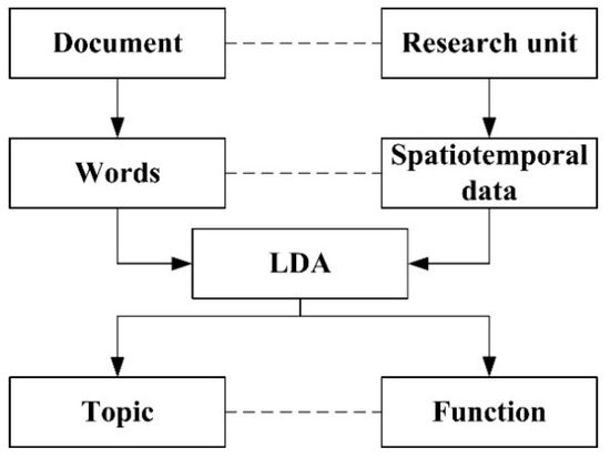 Urban functional zoning research and text semantic research are similar. As shown in Figure 2, a research area is regarded as a document, the spatiotemporal data of human activity in the area are treated as words in the document, and the functional distribution of the area corresponds to the topic distribution of the document. Therefore, the concept of the LDA model can also be applied to regional function recognition to mine the functional structure of cities based on spatiotemporal data.