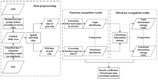This paper uses the human activity information contained in floating vehicle trajectory data and the urban function semantic information described by the POI data to achieve an in-depth analysis of urban spatial function and mixed use. Urban function mixing refers to the mixing of two or more urban functions within a certain space and time range. The information entropy of urban functional structure can reflect the distribution of mixed urban functions well. To this end, based on the LDA model and histogram method, the H-LDA model is proposed, which can generate the human activity topic probability information, the Information Entropy concept is applied to analyze the degree of urban function mixture, and the POI data are used to define the functional category of the research units. Finally, the urban functional area and the mixed use are identified. The technical flow of this paper is shown in Figure 3.