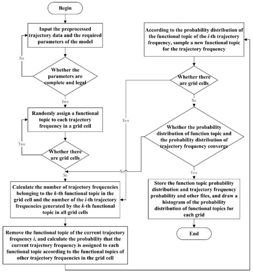 There are 2451 documents in this experiment, and each document has 24 words (each word is the same or different). The number of the urban function topics is set to 8, which refers to the number of POI categories (7 categories) divided in the Table 1 and the case of no data. By inputting these parameters and the iterative calculation of the distribution of function topics and trajectory frequencies, as described in Figure 4, the probability distribution of the urban functional topics in each grid can be obtained.