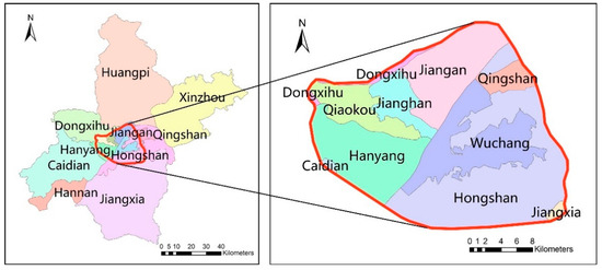 In this paper, the Wuhan Third Ring Road is used as the research area, as shown in Figure 5. Although the area of the seven main districts (Jiangan, Qingshan, Jianghan, Qiaokou, Wuchang, Hanyang, Hongshan) in the Third Ring Road represents only 10% of Wuhan City, its population accounts for more than 60%. Therefore, population movement in this area can reflect its functions and mixed use. The study area is divided into 2451 grid units, which will serve as a reference for planning at the block scale. The basic data include GPS data from more than 10,000 taxis and open source big data include more than 130,000 POIs obtained through a Baidu Maps application programming interface (API); these are both large-scale multisource heterogeneous data sets.