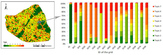 At the same time, the H-LDA model can describe the function probability distribution of each grid. Figure 7 shows the probability distribution of different topics for some grids in Figure 6b, from which we can clearly see the mixing of topics for each grid.