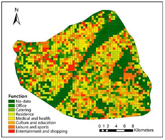 Based on a comparison between the functional distribution calculated with the POI data and the functional topic distribution calculated by the H-LDA model, the proportion of different functions included in each topic is obtained. As seen in Table 3, 64.8% of the grids with topic 0 calculated by the H-LDA model belong to the no-data function category, 3.8% of the grids belong to the office function category, and so on. The data distribution of the no-data function is ignored when identifying other function categories, and the function category with the largest proportion is the corresponding function of the topic. The final function recognition results are shown in the bold font, that is, topic 0 calculated by the H-LDA model corresponds to the no-data function category calculated with the POI data, topic 1 corresponds to the entertainment and shopping function category, topic 2 corresponds to the culture and education function category, topic 3 corresponds to the residence function category, topic 4 corresponds to the office function category, topic 5 corresponds to the catering function category, topic 6 corresponds to the leisure and sports function category, and topic 7 corresponds to the medical and health function category. The topic distribution calculated based on the H-LDA model is matched to the functional distribution calculated based on the POI data, and the results are shown in Figure 10.