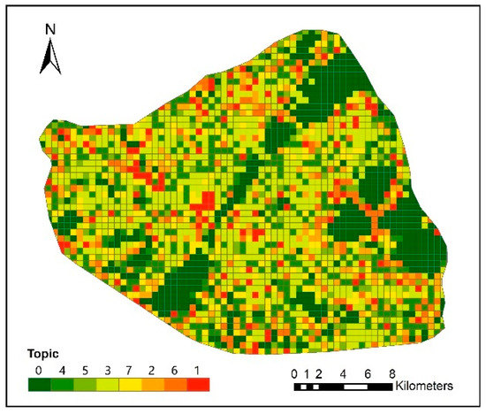 The probability assigned to each of the different topics of each grid is calculated by applying the H-LDA model, and the functional topic of each grid is determined according to the maximum probability value. The H-LDA model not only facilitates viewing the distribution of urban functional topics in different grids but also makes it possible to calculate the topic information entropy (TIE).