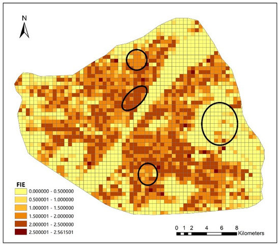 The level of information entropy can reflect the degree of mixed use of urban functions. The higher the entropy value is, the more the function categories exist in that grid, and the smaller the difference in the number of function categories. The proportion of different functions of each grid is calculated according to the FD/CP index, and the information entropy formula is applied to calculate the degree of functional mixed use for each grid. The FIE is divided into 6 levels, and the results are shown in Figure 11.