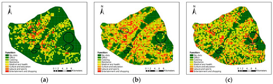 Cities can also be regarded as a system, in which the structure and form of the city is a spatial mapping of the system, and their function is core contents of the study of urban structure and form. The research challenge lies in how to quantitatively describe and mathematically analyze the different functions produced by urban structure and form. The level of information entropy can reflect the mixed function distribution of different research units in the city. When the distribution of function types in a certain research unit in a city is more balanced, a larger the entropy value reflects a higher degree of functional mixing in the unit [40]. The information entropy model can provide an effective method for a quantitative analysis of the mix of urban functions.
