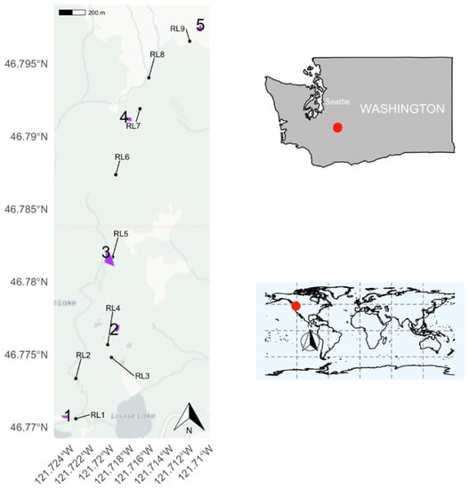 Meadow study sites at Mt. Rainier National Park; five sub-alpine meadows colored in purple are approximately 100 m apart in elevation and cover an elevational gradient from 1490 m to 1900 m. Polygons are the sites from the study Theobald et al. (2017), and the dots annotated with RL1-9 are plots from MeadoWatch.