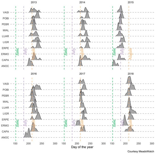 To associate the satellite images to peak flowering, we developed a method to determine peak flowering window by elevation: first, we deduced flowering windows from field-based MeadoWatch observations (collected on the trail adjacent to meadow polygon) observations for 2017 and 2018 when PS, L8, and S2-1B imagery was available. Then for validation, we determined flowering time for 2013–2015 from observations from MeadoWatch and Theobald et al. (2017) when only L8 imagery was available. Example kernel density curves of observed flowering of top 10 recorded species for 6 years from MeadoWatch (2013–2018) are presented in Figure 2; 2015 showed a considerable shift in peak flowering day due to unprecedented warm temperatures (in contiguous United States average temperature was 2.4 °F above the 20th century average). See Appendix D for imagery and study period details.