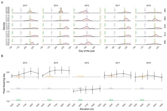 Peak flowering windows using MeadoWatch observations. (A) Kernel density of flowering observations by elevation (in meters) and year. (B) Estimated flowering windows calculated using mean flowering day and ±1 SD; error bars indicate length of the flowering window with the dot signifying mean peak flowering day. Note the shift in flowering phenology in 2015, a historically warm year.