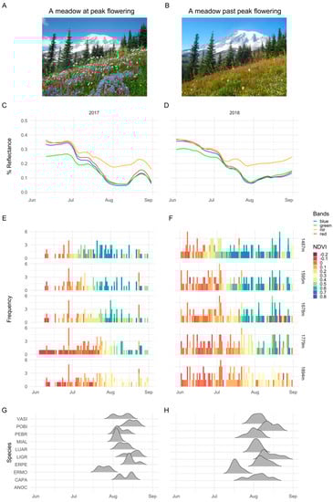 (A,B) A typical flowering meadow at peak, and a meadow past the peak flowering. (C,D) Reflectance profile of all the meadows across two years (2017 and 2018) using PlanetScope item PSScene4Band (type analytic_sr) in the Planet workflow (PS). (E,F) Normalized Difference Vegetation Index (NDVI) profile of all the meadow sites by elevation for two years (2017, 2018) using PS. On the alternate y-axis is the elevation in meters, and y-axis shows the number of PS captures/meadow having the corresponding NDVI threshold. The NDVI thresholds are determined by taking the average of NDVI metric across the entire meadow. (G,H) Flowering observations for years 2017 and 2018 from MeadoWatch; showing dominant 10 flowering species.