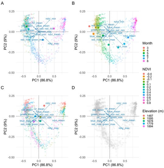 Biplot ordination from the principal component analysis (PCA) for 2 years (2017 and 2018) of spectral data from PS for the 5 meadow sites. (A–C) PC1 and PC2, overlain with the centroid (filled large dots) and average summary reflectance’s captured in visible and near infrared (NIR) bands colored by month, NDVI, and elevation (blurry dots); (D) the ordination without any highlighting of the individual summary reflectance’s. (A) Seasonal trends are evident; snowmelt in the meadows to flowering from upper left to upper right in the panel; blurry dots are colored by month. (B) Flowering months (late July and August) demonstrate higher positive mean values of NDVI in panel; blurry dots are colored by NDVI. (C) Flowering at sites showing the spread by elevation explained by increase in NDVI in the flowering months; blurry dots are colored by elevation of the meadow. (D) Strong correlation between visible bands, and NDVI metric that is orthogonal to NIR/visible bands.