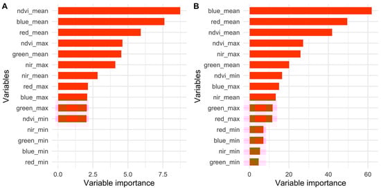 Relative importance of predictor spectral variables related to flowering when fine resolution imagery was used versus when fine-level imagery was combined with coarser resolution imagery. (A) Using PS only highlights NDVI as the top contributor. (B) PS, along with L8 and S2-1B, highlights the blue band as the top contributor.