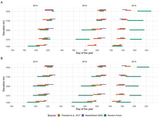 Qualitative comparison of observed window from the in-situ observations of (Theobald et al., 2017), MeadoWatch program, and Random Forest (RF) based flowering window. (A) Predicted and Observed peak flowering window when only 3-m (PS) resolution data was used for training. (B) Predicted and Observed peak flowering window when 3-m (PS) resolution, along with 10-m (S2-1B) and 30-m (L8) data, was used for training.