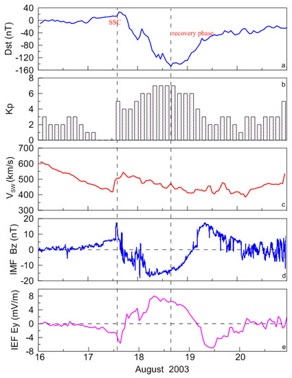 On 17 August, 2003, the storm sudden commencement (SSC) of a geomagnetic storm was at 14:21 UT. Figure 1 displays the geophysical conditions during the 16–20 August, 2003, including the variations of Dst index, Kp index, solar wind speed (VSW), the south-northern component of Interplanetary Magnetic Field (IMF) BZ, and the Interplanetary Electric Field (IEF) Ey ().