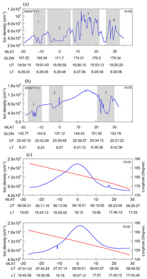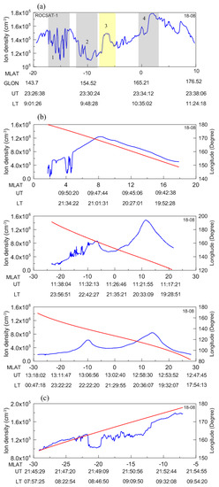 The variations of ion density along the ROCSAT-1 trajectories in 160°E longitude region during 23:26–23:38 UT (a), 09:42–09:50 UT, 11:17–11:38 UT, and 12:47–13:18 UT (b), 21:45–21:54 UT (c) on 18 August, 2003 are presented in Figure 4, respectively. MLAT, GLON, UT, and LT are also given at the bottom of Figure 4a, the red lines represent the longtiude variations along the satellite trajectories in Figure 4b,c.