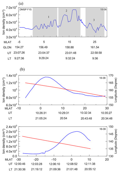 Figure 2 shows the variations of ion density along the trajectory of DMSP F13 satellite during 18:50–19:04 UT (a), 20:31–20:45 UT (b) at 160°E longitude region on 18 August, 2003, respectively. At the bottom of Figure 2a,b, magnetic latitude (MLAT), geographic longitude (GLON), UT, LT are also marked.