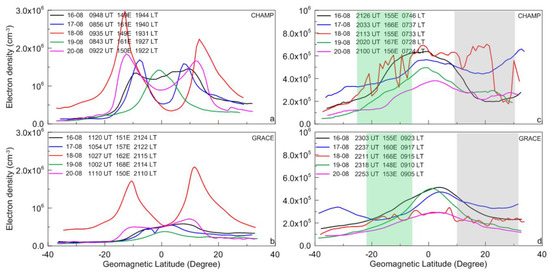 Electron densities from CHAMP (a,c) and GRACE (b,d) at the 160°E longitude sector at different times during 16–20 August, 2003, respectively.