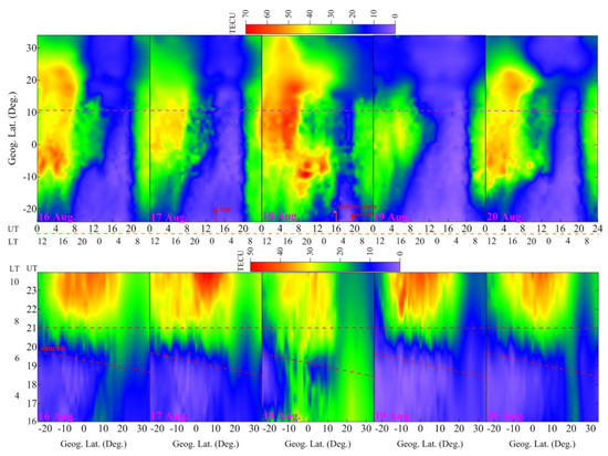 As shown in Figure 4b, the density at 600 km was enhanced significantly, and the EIA structure was still detected around 11:30 UT (21:35 LT) and 13:06 UT (22:22 LT). On 18 August, the density in low-latitude regions was remarkably larger than that during other days, as shown in Figure 5. From Figure 6, we can also see the EIA around 09:00 UT (19:40 LT) and 10:30 UT (21:10 LT) enhanced more significantly at CHAMP altitude and GRACE altitude than that on other days, respectively. Moreover, it should be noted that TEC values increased significantly in low-latitude regions during 04:00–21:00 UT (14:40–07:40 LT) on 18 August, as shown in Figure 7. Especially during 16:00–21:00 UT (02:40–07:40 LT), it can be seen that EIA was well developed, while EIA structures were not seen in other days.