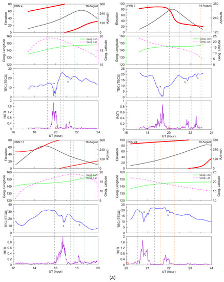 Figure 8a is for satellites pseudo-random noise (PRN) 4 (left top panel), PRN 7 (right top panel), PRN 11 (left bottom panel), and PRN 24 (right bottom panel) at the CNMR station during 16:00–24:00 UT on 18 August, 2003, respectively. Figure 8b is for PRN 4 (left top panel), PRN 7 (right top panel), PRN 13 (left bottom panel), and PRN 20 (right bottom panel) at GUAM station, and Figure 8c is for PRN 4 (left top panel), PRN 7 (right top panel), and PRN 28 (bottom panel) at LAEL station.