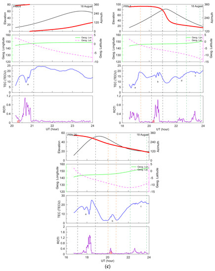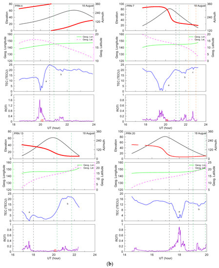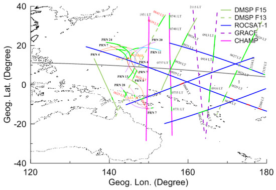 During 20:00–22:00 UT (around local sunrise), TEC disturbances were also detected at CNMR, GUAM, and LAEL stations, respectively, which were very consistent with the observations from DMSP F13 shown in Figure 2. No similar TEC disturbances were detected by the GPS satellites on other days, the TEC variations during 16–19 August at CNMR and LAEL stations can be seen in the “Supplementary Materials”. At CNMR, PRN 4 detected TEC depletions around 20:00 UT (05:48 LT), and small TEC disturbances around 21:00 UT (06:48 LT). Small disturbances also were detected by PRN 7 around 22:00 UT (07:48 LT), ROTI reached about 0.4. PRN 24 detected large TEC depletions during 20:30–21:00 UT (06:18–06:48 LT), and smaller TEC depletions around 22:00 UT (07:48 LT). At GUAM, PRN 4 also detected TEC large depletions around 20:00 UT (05:48 LT) and small TEC disturbances around 21:00 UT (06:48 LT). PRN 7 recorded TEC disturbances around 22:00 UT (07:48 LT). In the southern hemisphere, at LAEL, during 20:30–21:00 UT (06:18–06:48 LT), TEC disturbances were detected by PRN 4, and ROTI exceeded 1. PRN 7 also detected TEC disturbances during 20:00–21:00 UT (05:48–06:48 LT) and around 23:00 UT (08:48 LT), respectively. Moreover, the disturbances were recorded by PRN 28 around 22:30 UT (08:18 LT), which was also detected by DMSP F13 around 20:43 UT (06:23 LT), and by ROCSAT-1 around 23:27 UT (09:06 LT) in the same region, respectively, as shown in Figure 9.
