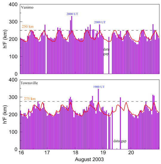 During 16–20 August, 2003, variations of minimum virtual height (h’F) at Vanimo (top panel) and Townsville (bottom panel), respectively. The red lines represent the median h’F during August 2003.