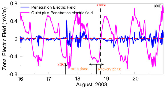 Furthermore, in Figure 11, we present the variations of Penetration Electric Field and quiet zonal electric field plus penetration electric field derived from the real-time model of the ionospheric electric fields [36] at 160°E sector during 16–20 August, 2003. The Scherliess and Fejer [37] vertical drift model is used as the quiet zonal electric field, which has positive as eastward. The blue line represents the penetration electric field calculated from the IEF Ey and transfer function [36], the magenta line represents the quiet background zonal electric field plus the penetration electric field. In the Indian and South American sectors, the predicted zonal electric fields were in good agreement with observations from the digisonde-derived vertical plasma drifts [9,36].