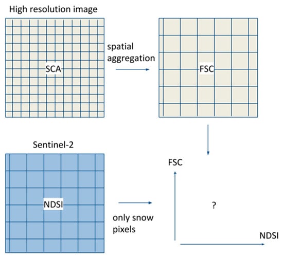 Schematic of the method used to determine the NDSI–FSC relationship. In this study the spatial aggregation was done using the average of all contributing pixels unless there was at least one no-data value. Then the FSC pixel was set to no-data.