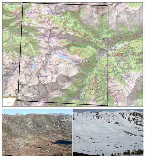 Top: topographic map of the Bassies area (42°45′N, 1°25′E in the Pyrenees, France). The black polygon indicates the outline of the Pléiades acquisition (source: IGN/SCAN25, www.geoportail.gouv.fr). Bottom: photographs taken from Col de la Serrette near the geographic center of the study area (26 October 2014, 11 March 2015).