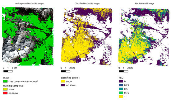 The resulting Pléiades multispectral orthoimages were used to generate the SCA maps of the five acquisitions with a pixel-based supervised classification. For each date, the few cloud pixels were manually delineated to restrict classification to cloud-free areas. The same procedure was applied to water bodies. Then we manually delineated about 15 homogeneous polygons of snow and no-snow surfaces (ground and vegetation) based on a color composite of the multispectral image which enhances the contrasts between rocks, water, vegetation and snow (NIR/red/green bands). These polygons were used to extract samples to train a random forest classifier with the Orfeo Toolbox [31]. The resulting 2 m SCA maps (Figure 3, middle panel) were then down-sampled to obtain 20 m FSC maps by computing the weighted average of all contributing pixels. If there was at least one no-data pixel among the contributing pixels then the FSC value was set to no data (Figure 3).