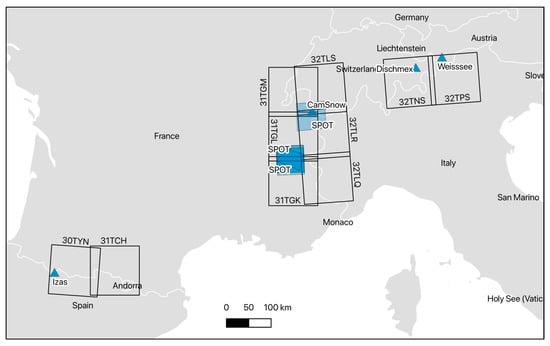 - SPOT: Five SPOT-6 and SPOT-7 maps of the snow cover area at 6 m resolution obtained by supervised classification [12]. Each SPOT scene covers a region of about 2900 km2.