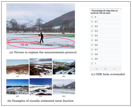 Open Data Kit (ODK) Collect is an open source application for Android smartphones that replaces paper forms used in survey-based data gathering. For this study, a custom form for the ODK Collect application was made to allow the survey of the snow cover fraction around the observer. The ODK Aggregate application was installed on a server hosted by CESBIO to collect survey data. On 5 February 2020 a website was set up to explain the installation procedure and the measurement method (Figure 6). The announcement was spread using social media and mailing lists. The form and website were written in French. Consequently, most of the data were collected in the French Alps and Pyrenees. The participants were asked to estimate the snow-covered fraction of the surface in a disk of radius 10 m, centered at their position once the geolocation accuracy of their smartphone reached 5 m. The snow fraction value could be reported in the ODK form at a 10% interval between 0% and 100%.