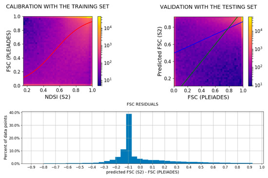 The calibration of the NDSI–FSC function with the Pléiades data returned the values a = 2.65 and b = −1.42 with an RMSE of 25% (Figure 7). In validation mode, the same RMSE was obtained, suggesting that the estimation of the error is robust (Table 3).