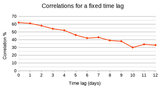 Evolution of the correlation coefficient between Sentinel-2 NDSI and Izas FSC as a function of the time lag.