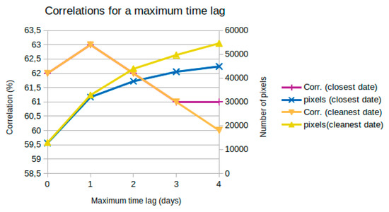 Figure 9 illustrates the tradeoff between the “cleanest” and “closest” approaches in selecting the matching Sentinel-2 product. The number of pixels is higher with the cleanest method since this method selects the least cloudy image in a given time window, but the correlation coefficient is lower than the correlation coefficient of the closest method beyond 3 days, for the same reason as given in Figure 10. However, this analysis suggests that the difference between both methods is minimal. Given that the “closest” method is numerically more efficient, we kept this method with a time window of 4 days to perform the next analyses.