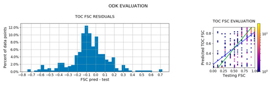 Results of the evaluation of the FSC using ODK data. Blue line: Linear regression between the predicted and the testing FSC sets. Green line: 1:1 line. The color bar indicates the number of samples by bin.