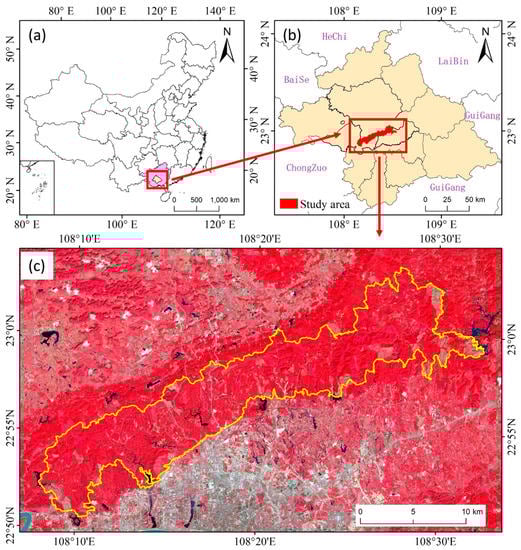 Location of the study area: Gaofeng Forest Farm in northern Nanning City, Guangxi, China: (a) China, (b) Guangxi Zhuang Autonomous Region, (c) Gaofeng Forest Farm (highlighting in yellow boundary).
