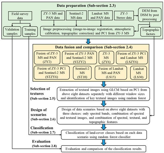 The strategy of mapping land-cover and forest distribution using different data sources is illustrated in Figure 2. The major steps included the following: (1) Collection and organization of different data sources such as remotely sensed and field survey data. For this study, all remotely sensed data were registered to the Universal Transverse Mercator (UTM) coordinate system and atmospherically and topographically corrected; and all field survey data were organized and randomly selected as training samples or validation samples. (2) Extraction of DEM data from the ZiYuan-3 (ZY-3) stereo image. The resulting DEM data were used for topographic correction of remotely sensed data and for calculation of topographic factors. (3) Data fusion of different spatial resolution images or different optical sensor data. (4) Extraction and selection of textures and design of data scenarios. (5) Implementation of land-cover classification using a random forest (RF) classifier based on different scenarios. (6) Comparison and evaluation of classification results.