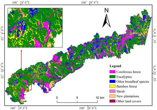 Based on data scenarios currently used, some forest types have relatively low classification accuracies that are not suitable for real applications such as forest management. Considering that Masson pine and Chinese fir belong to coniferous forest, they can be grouped into that class, while Chinese anise, Castanopsis hystrix, Schima, and other broadleaf trees, which constitute a small proportion of this study area, can be grouped into one class called other broadleaf species (except eucalyptus). The newly merged classes—coniferous forest and other broadleaf species—had average accuracies of 91.0% and 85.3%, respectively. Overall accuracy and kappa coefficient of seven classes became 88.9% and 0.86, respectively, and mean accuracies of forest classes reached 85.3–91.1% (see Table 7). As an example of the classification image with seven land-cover classes, Figure 3 shows that eucalyptus plantations were distributed throughout the study area and made up the largest proportion, followed by coniferous forest. Other broadleaf forests and bamboo forests had small proportions and were widely dispersed.