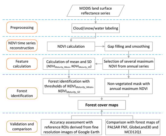 Trees and herbaceous plants show specific seasonal growth trajectories. For evergreen trees, leaves maintain high greenness throughout the year. For deciduous trees, leaves usually grow and senesce quickly in a short period at the beginning and end of the growing season, and the greenness of leaves remains relatively stable during the maturity period. In contrast, for herbaceous plants, leaves generally continue to grow and then senesce slowly during the growing season. Accordingly, the NDVI seasonal curve shows a distinctly different shape for tree-dominated forests and herbaceous vegetation. It is relatively flat during the vegetation maturity period for the former, with NDVI values remaining around high values, while it presents a parabolic shape with an opening downward for the latter. Based on these distinctive seasonal characteristics, two features were proposed to differentiate the two vegetation types, namely the mean and SD of the NDVI during the vegetation maturity period. These two features were generated from annual MODIS observations to map forest cover with the following steps (Figure 2):