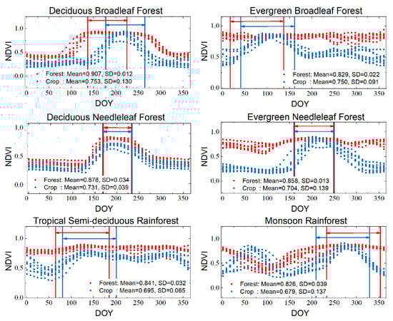 NDVI time series for various forest and adjacent cropland sites from 2010 to 2017, including deciduous broadleaf forest (Morgan Monroe State Forest, USA), evergreen broadleaf forest (AekLoba, Sumatra), deciduous needleleaf forest (Krasnoyarsk, Russia), evergreen needleleaf forest (Howland, USA), tropical semi-deciduous rainforest (Budongo Forest, Uganda) and monsoon rainforest (78.79° N, 15.56° E, India). Detailed information is shown in Table 1. Red and blue represent forests and crops, respectively, and the periods indicated by the arrows are the vegetation maturity period. The values of mean and SD in the figure refer to and , respectively.