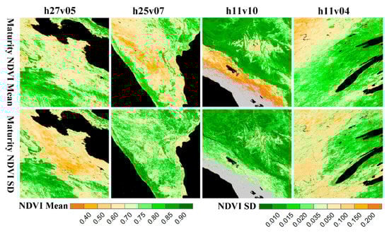 Maps of and for four MODIS tiles in 2010, including h27v05, h25v07, h11v10 and h11v04. The gray color refers to non-vegetated areas.