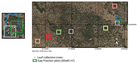 Aerial view (right) of the study site and zoom-in on the leaf collection trees (left). Different Gap Fraction plots and leaf collection trees are identified with different colors.