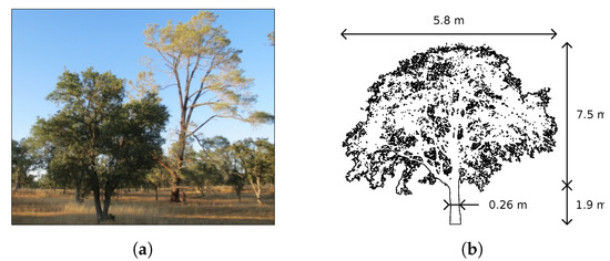 Panel (a), a picture of both a Blue Oak (foreground) and a Grey Pine (background). Panel (b), average dimensions of Blue Oaks at Tonzi Ranch.