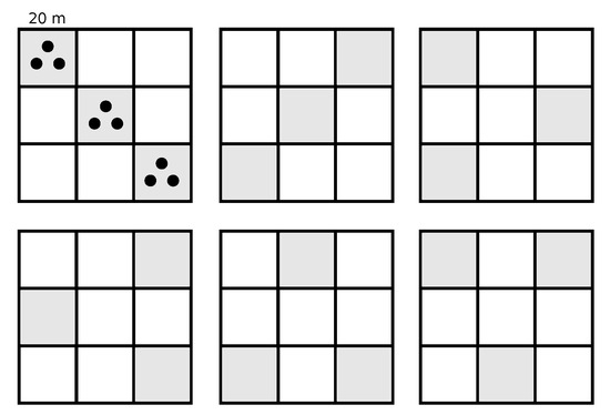 Possible sampling patterns of the Gap Fraction plots. For each plot, three digital hemispherical photographs (DHP) (black dots) were taken in a North–South East–Southwest pattern 10 m apart in each of the three randomly selected 20 m × 20 m subplots (shaded in gray).