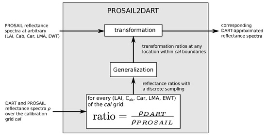 Both PROSAIL and DART were used to compute scene reflectances over a calibration (LAI, , Car, LMA, EWT) grid hereafter designated as . Band reflectance ratios were computed for each point of the grid and used to calibrate linear 5-D interpolators. These interpolators are used to transform any reflectance obtained with PROSAIL into a reflectance similar to what DART would have obtained. For each date, one 5-D interpolator was computed for each (CC, understory reflectance, Anthocyanins content ()) triplet as these parameters were either not possible to model in PROSAIL (CC) or to limit the uncertainties (understory reflectance, ). This calibration/transformation method is hereafter called PROSAIL2DART (P2D). A diagram of the methodology is shown in Figure 4.